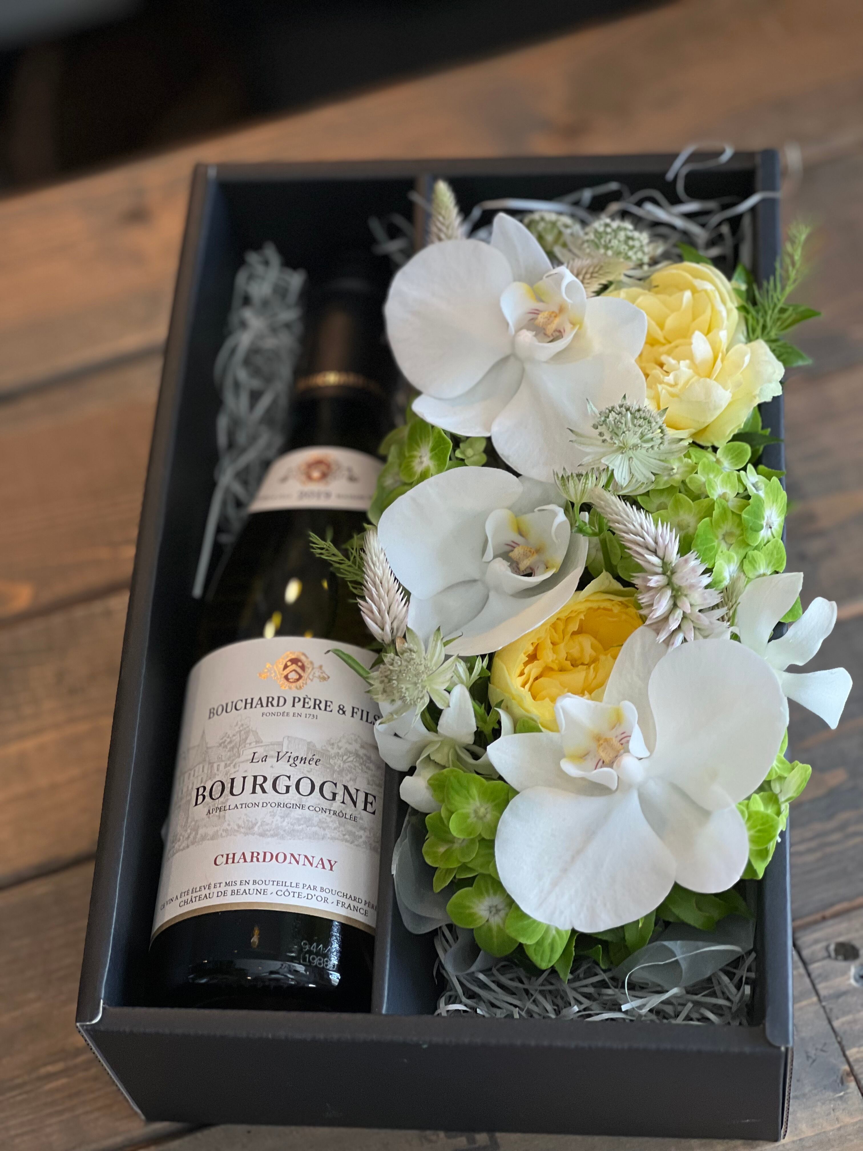 美しいお花と一緒にワインやシャンパンを楽しむアレンジメントです。お花の華やかさと、ワインの味わいが心を豊かにする特別な組み合わせです! 退職祝いや就任祝い、お誕生日や記念日など特別を日を祝うフラワーギフトです。