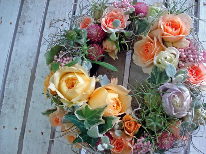 新鮮な季節のお花で作り上げた、華やかで上品なリースアレンジメントです。特別な日を祝うためのアイテムとして、テーブルの上に飾ったり、壁やドアにアレンジすることもできるので、多様なシーンで楽しんでいただけます!